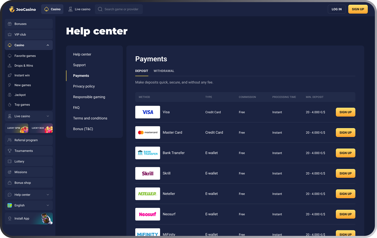 Visa, MasterCard, Maestro, Netteler, Klarna, Bank Transfer, PaysafeCard, Skrill, Interac, Ecopayz, Skrill Rapid, iDebit, CoinsPaid, Bitcoin, Ethereum, Tether, Dogecoin, Bitcoin Cash, Litecoin, Piastrix, MiFinity, Zimpler.