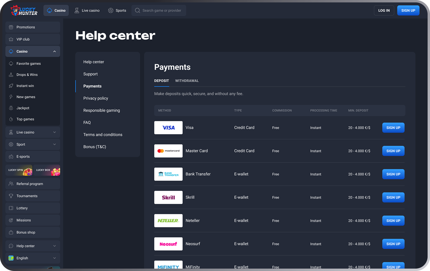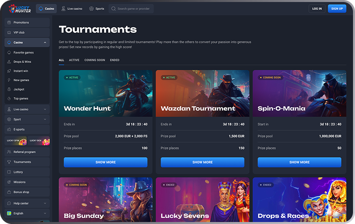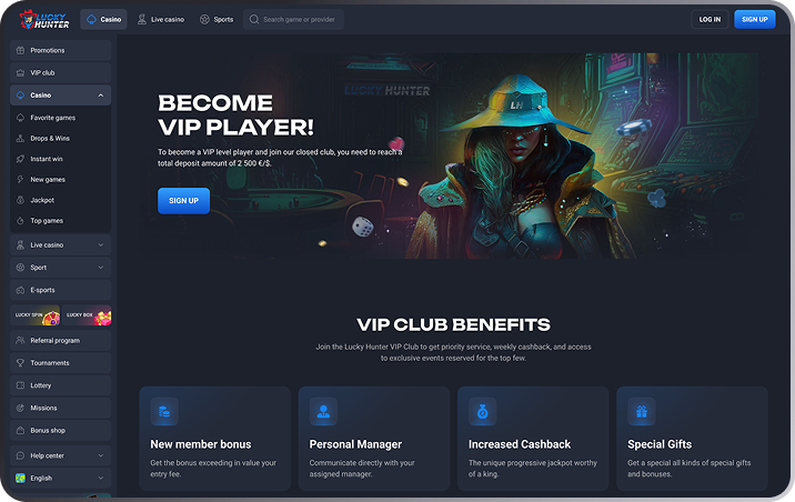 At Lucky Hunter, it’s all about the thrill of the hunt — and emerging as the top predator. Licensed by Curaçao, Lucky Hunter is your prime hunting ground for both fiat and cryptocurrency deposits, ensuring a secure and rewarding gaming experience. Bonuses on the first four deposits, Mystery Drops, and Lucky Spin are guaranteed to leave you howling for more. Enjoy exclusive perks and rewards tailored for the most elite hunters in the Lucky Hunter VIP Club. Join fellow hunters in fierce competitions and tournaments, where you can showcase your skills and claim victory. Our arsenal of games are sourced from a diverse range of providers: explore the dense forests of slots, stalk the tables for strategic conquests, or engage in live dealer experiences that bring the hunt to life.