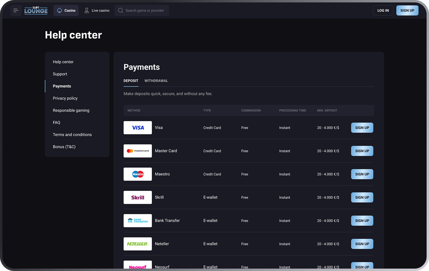 Visa, Master Card, Apple Pay, Google Pay, Bank Transfer, Neosurf, Bitcoin, Ethereum, USDT, Dogecoin, Litecoin, Bitcoin Cash, Postepay, eZeeWallet, MiFinity