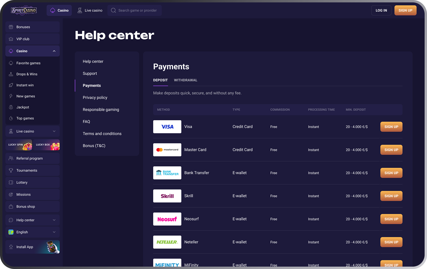 Maestro,Visa, Master Card, Jeton, MiFinity, CashToCode, Astropay, Neosurf, MuchBetter, Flexipin, Ecopayz, Skrill, Neteller, Bitcoin, Ethereum, Litecoin, Bitcoin Cash, Dogecoin, USDT.