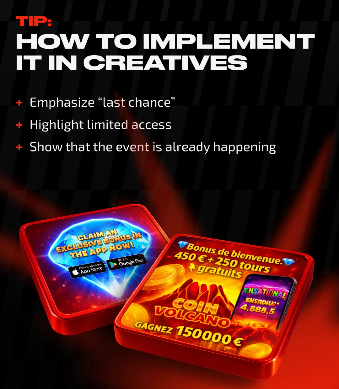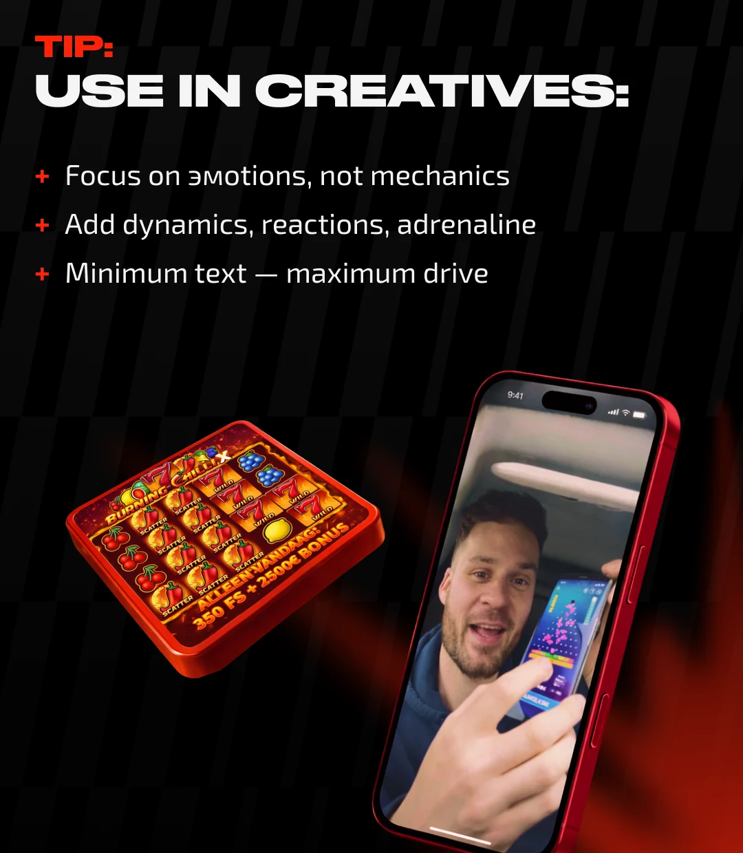 At the same time, it is important to avoid overloading creatives with text. The less explanation and the more energy, the stronger the emotional impact.